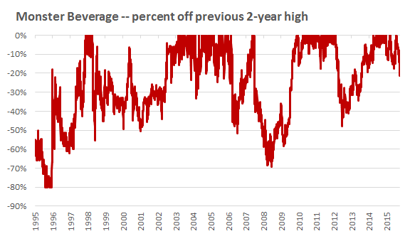 This chart shows when, and by how much, Monster stock was below its high of the previous two years. (Periods at 0% show when shares hit a new two-year high). Again, this was during a period when shares increased more than a thousand-fold: