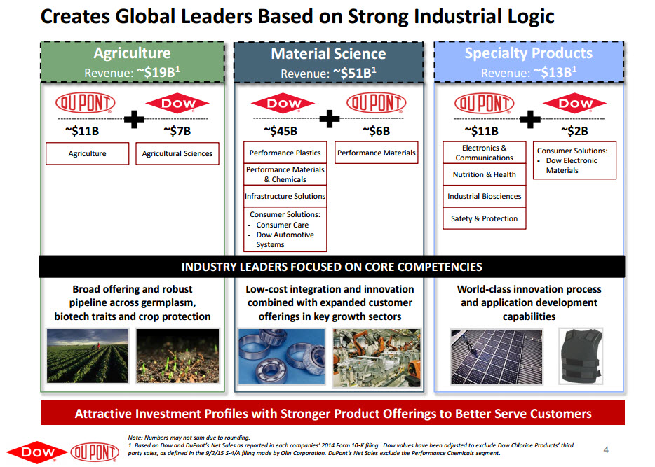On Dec. 11, 2015 DuPont (DD +0.00%) and Dow Chemical (DOW +0.00%) proposed an all-stock merger of equals. The combined company will spin-off three independent companies over the subsequent 18 to 24 months after the closing of the merger.