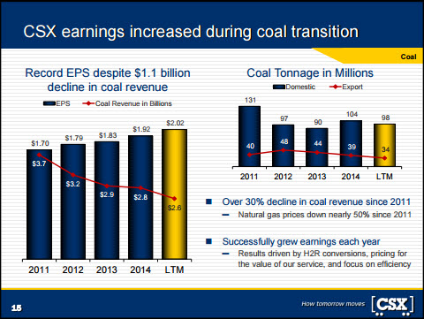 CSX (CSX +1.78%) has felt the pressure from the downward trend in coal demand -- likely a secular trend. High levels of utility stockpiles and lack of international demand have cut back capacity and added to the downward pressure. It's difficult to envision a real return to coal demand with regulatory overhang, lower natural gas prices, and a strong dollar.
