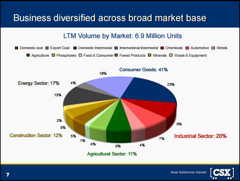 It has a diversified revenue stream, with merchandise making up 60% of revenue and 42% of volume in 2014, coal at 22% of revenue and 18% of volume, and intermodal at 14% of revenue and 40% of volume. The company also has a diversified market base: