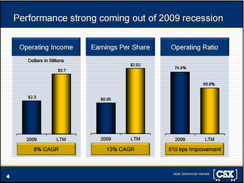 A key metric for railroads is the operating ratio, which is a primary measure of profitability, expressing a company's operating expenses as a percentage of revenue -- the inverse of operating margins. CSX was able to increase its number 20 basis points to 71.6% for the most recent quarter. The operating ratio for all of 2015 was 69.7%. Management continues to focus on this number, with a goal of hitting the mid-60s in 2016. The lower the operating ratio, the more efficient the company. CSX has shown a consistent improvement trend in operations since 2009.