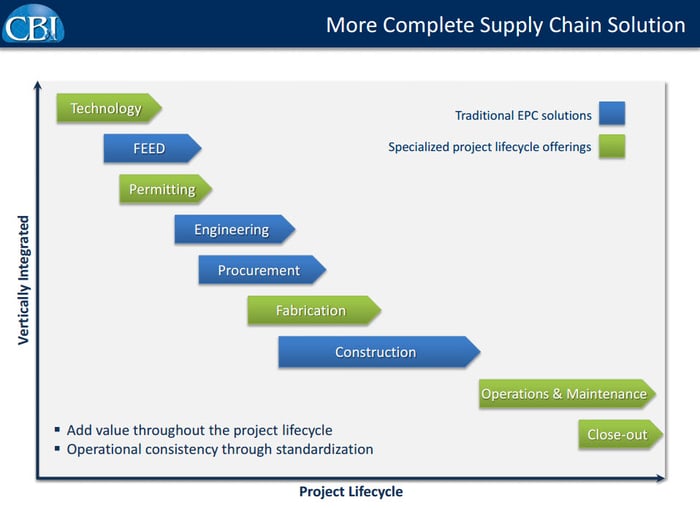 Despite the downturn in energy prices, the population is growing and will need to consume more energy. This secular trend positions CB&I well through its servicing of onshore and offshore projects (upstream activities), processing, refining, and LNG (downstream activities), and petro- and nuclear-based power generation. In short, there's a high probability that companies and countries will continue to invest in power and other energy facilities, such as generation, storage, and pipelines.