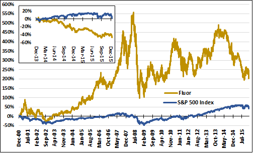 At current prices, Fluor is trading at 11.3 times Yahoo! Finance's consensus estimate for 2016: Not a bargain price, but within sight of one. At these levels, surprises at the company are most likely to be positive. It was a brave investor who bought Fluor in Q1 2010, but the rebound in orders from there was remarkable, and something similar could happen now. In the nature of Fluor's business, orders are bumpy and a single order can be transformative. The company has already weathered more than a year of weak commodity prices without witnessing a decline in its backlog: New orders have been weak, but completions haven't been strong, either. There's considerable risk in Fluor at the best of times, but brave investors could benefit if they can build positions even slightly lower than current prices.