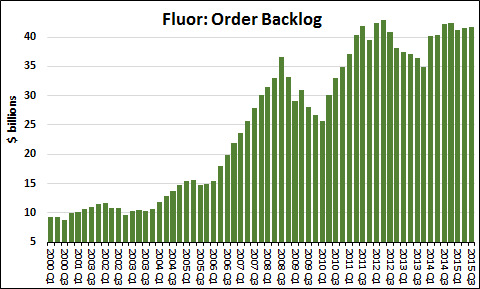 Fluor's order backlog has plateaued, admittedly at high levels. That isn't to say new orders won't materialize -- they're actually trickling in fairly steadily -- only that there's no obvious, compelling economic incentive for them to increase. After a spike in 2014, new orders slowed down considerably in the first nine months of 2015, and there is, of course, a risk that Fluor's backlog will gradually erode.