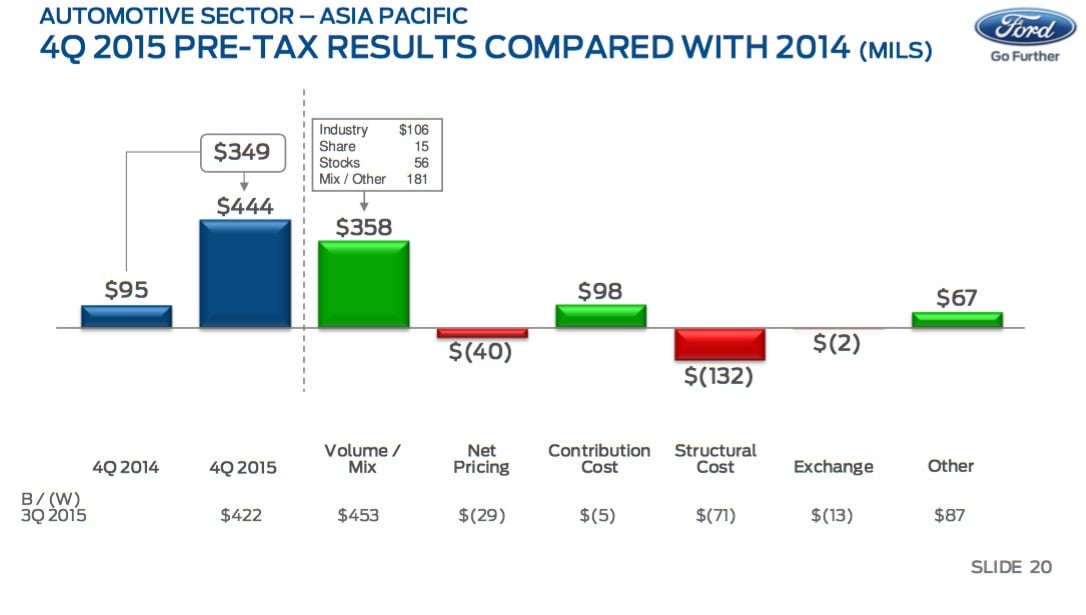 You can see that in this slide from Ford's fourth-quarter earnings presentation. That $444 million profit included $490 million in equity income from Ford's two joint ventures in China. (Yes, Ford took a loss on the rest of the Asia Pacific region, as it's still ramping up production in places like India, on the heels of its $5 billion Asian expansion effort.)