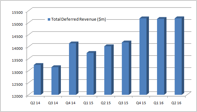 Turning to deferred revenue, year-over-year growth of 8.3% looks impressive, but as the chart below shows, deferred revenue has been sequentially flat for the last two quarters.