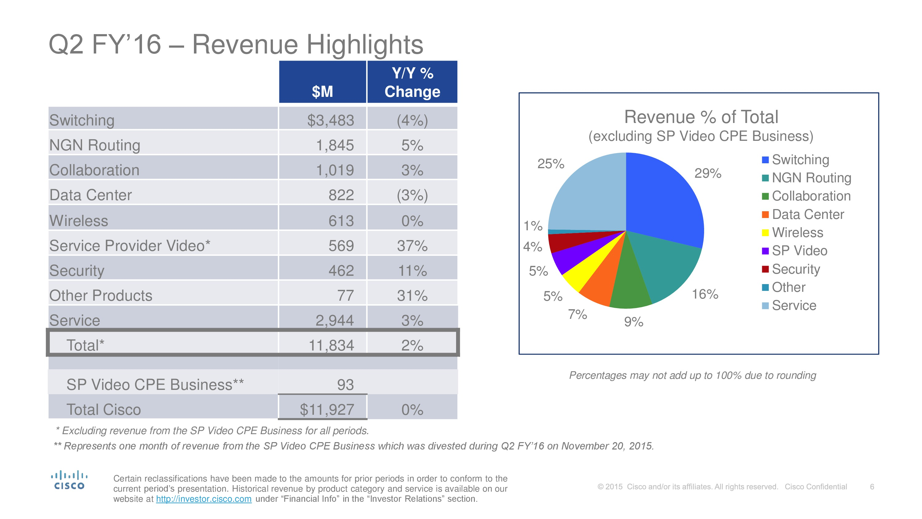 In a sense, it was a typical Cisco quarter, just one with a bit more economic weakness. By typical, I mean low single-digit growth with various parts of the portfolio of business bouncing up and down. For example, BRIC spending and networking bounced back from weak quarters, but enterprise spending and switching remained weak. It was also a negative quarter for data center spending.