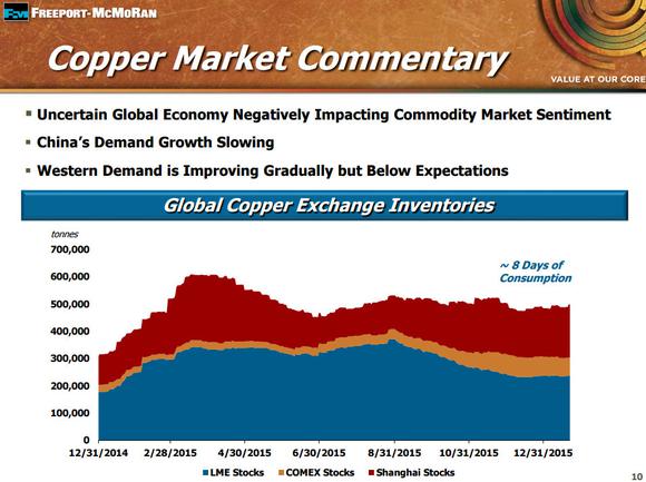 Unquestionably, the uncertainty about the global economy is negatively impacting financial market sentiment. China's demand growth is slowing. Our Western demand is not as good as we and others had hoped it would be, but it's still expanding gradually. I'm not going to debate anyone about the market. The market is what the market is. But the facts are that in the copper business differs from other commodities in that there is not an enormous excess supply in inventories. We just show [in the slide below] the exchange stocks that's developed from the end of 2014 to the current date, similar story when you look at total global inventories. But here we have exchange stocks not rising significantly, remaining low by historical standards, at a time when the copper price has gone from $2.88 to $2 from the end of 2014 to the current date. It is -- even looking at the decline in prices so dramatically since the third quarter, inventories are not building. The story is fundamentally, in today's world, the business we're seeing is not as negative as the financial markets are reacting to it.