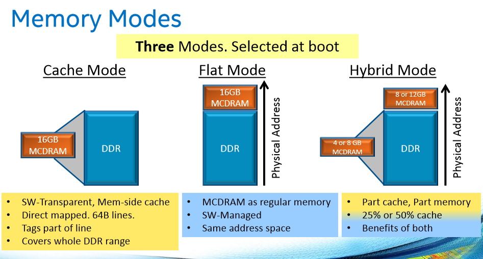 Indeed, in a presentation at Hot Chips 2015, Intel showed that the MCDRAM on Knights Landing can be used in three ways: as a very large "cache memory" for the CPU, in conjunction with the DRAM, or in a kind of "hybrid" mode (see the slide below).