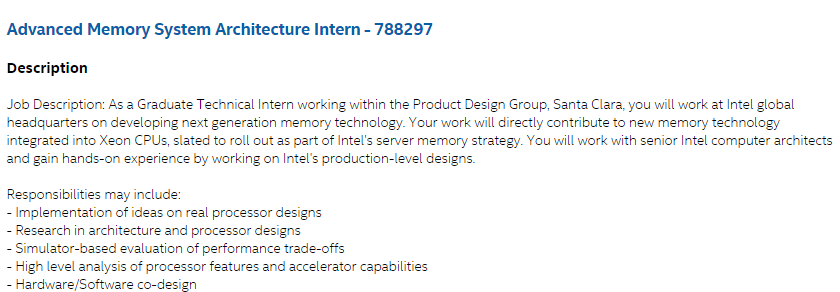 If you study the listing carefully, you'll note that the company is working on "new memory technology" that's intended for integration with Xeon processors. It makes sense that Intel will eventually start integrating fast memory on the CPU package in order to boost the available memory bandwidth to these many-core monsters.