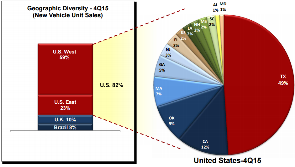 The decline in oil and gas prices have negatively affected the economies of Group 1's prime markets in Houston, Oklahoma, and Texas in general which, as you can see above, is a huge chunk of the company's sales. If you know anybody working in the oil industry, you can understand why individuals and companies are hesitant to buy new vehicles with such a downturn in oil prices, jobs and drilling activity in general.