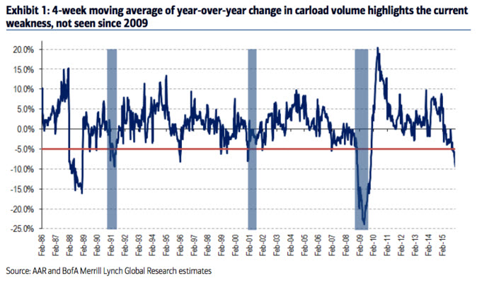 Historically, a decline in rail traffic is a leading indicator of a slowdown in the economy. A recent note from Bank of America states: