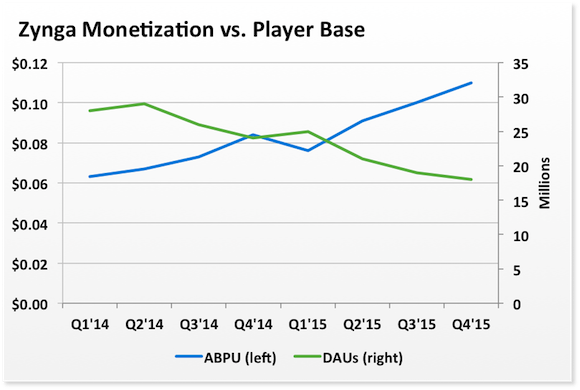 Make no mistake. Zynga's player base is shrinking, and fast. But at the same time, Zynga has been able to significantly improve monetization among these daily active users, or DAUs. They keep coming back for more, even if they are in fewer numbers. Average bookings per DAU continues to march higher, hitting a new record of $0.11.