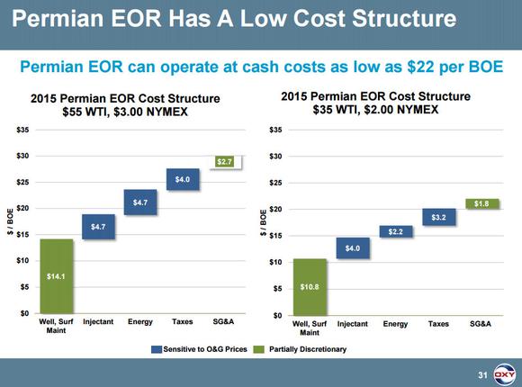 Cash flow is a slightly different story because lower commodity prices are going to weigh on Occidental Petroleum's operational cash flow. However, the company's diversification helps it mute some of this weakness. For example, it has a very large enhanced oil recovery business in the Permian Basin that continues to produce a lot of cash flow. As the slide below shows, the company's cash costs can be as low as $22 per barrel of oil equivalent, which means it's still delivering solid cash flow at today's oil price: