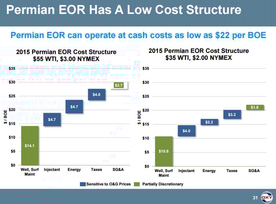 Cash flow is a slightly different story because lower commodity prices are going to weigh on Occidental Petroleum's operational cash flow. However, the company's diversification helps it mute some of this weakness. For example, it has a very large enhanced oil recovery business in the Permian Basin that continues to produce a lot of cash flow. As the slide below shows, the company's cash costs can be as low as $22 per barrel of oil equivalent, which means it's still delivering solid cash flow at today's oil price: