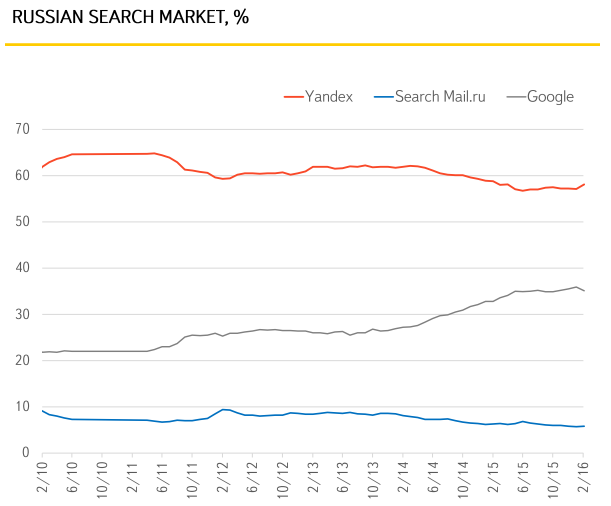 - Google also increased its share of Russian search from 35% last quarter to 35.2% in Q4, but has begun to lose ground to Yandex so far in 2016. Yandex's share climbed to 58% in February, thanks primarily to a 200 basis point gain in desktop search share.