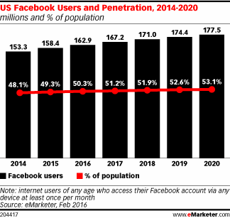 At the end of 2015, there were over a billion users logging into Facebook each day, 934 million of whom accessed it via a mobile device. Another first for Facebook, as per recent data from eMarketer, is that over half the U.S. population -- a number just shy of 163 million people -- either are, or will become, part of its massive MAU pie in 2016.