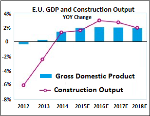 However, most of United Technologies' commercial building-related activities are outside the U.S., where, in most cases, it doesn't enjoy market leadership. One fairly authoritative source forecasts that the value of European construction output growth will accelerate to 3% after a disappointing 1.6% increase in 2015:
