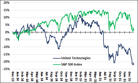 Many industrials received similar treatment, as investors absorbed the implications of dollar strength, Chinese weakness, and collapsing commodity prices. But United Technologies has some unique problems, notably the never-ending travails of its PurePower jet engines, although it has at last delivered some. United Technologies also suffers from the outlooks for the F-35 (which continues to be delayed and see orders scaled back) and military spending generally, which is at its lowest level in decades. The problems affecting Pratt & Whitney (which has problems with its new commercial engine as well as the issues mentioned with the military) and the aerospace unit are well known, and each week seems to offer another indication that they're no closer to solution. Even if they evaporated overnight, investors might applaud, but 2016 and probably 2017 earnings wouldn't be affected. If there are to be any positive earnings (as opposed to technical or order book) surprises from United Technologies, they'll come from its construction segment.