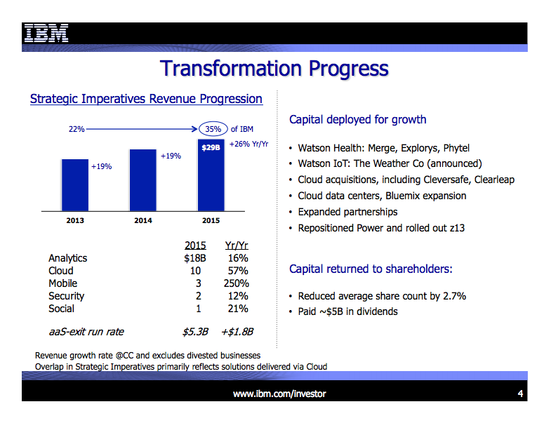 It's hard to blame the Berkshire Hathaway vice chairman for his wavering viewpoint. IBM's sloth-like transition from its hardware, software, and services business model to one predicated on big data analytics, cloud services, and the like has admittedly been a trying one for investors. As was widely noted in the wake of its disappointing earnings report in January, IBM's sales have now declined for 15 straight quarters, though its profits have proven far more durable. For instance, IBM's net income actually increased 9.7% for its full-year 2015, which at least partially speaks to the contrarian investment thesis I find so intriguing with IBM.