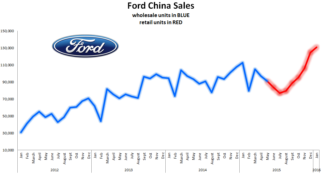 Note that the change in line color on the chart above indicates Ford switching from reporting wholesale sales to retail sales. While the retail numbers will be a slightly lower number than wholesale, it didn't slow Ford down much. The carmaker posted an excellent finish to 2015 and started 2016 on the right foot.