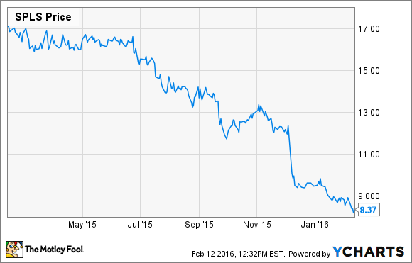 All of this uncertainty has crushed Staples stock over the past year. It's lost half of its value since its 2015 opening, and the situation hasn't improved in 2016, with Staples stock staying on a downward trend. It closed at $8.19 on Feb. 11.