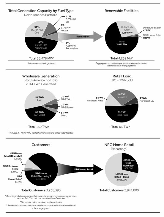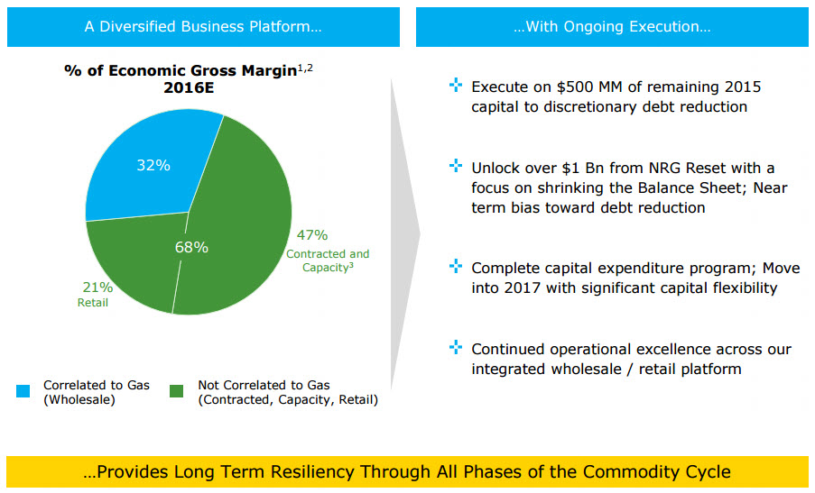 NRG's facilities consist of baseload, intermediate, intermittent, and peaking power, and most of its cash flow is derived from the sale of capacity and power from the baseload and intermediate facilities. Its operations through various energy segments give NRG a very diversified base that will allow it to withstand various commodity cycles.