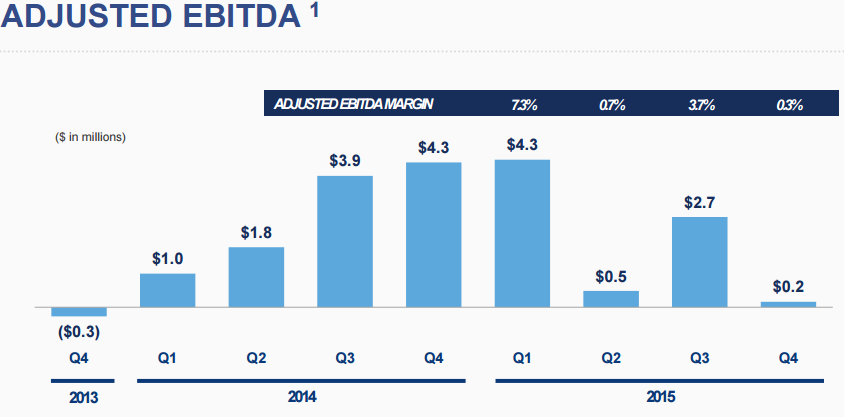 Now what: With today's sell-off, it appears many investors aren't willing to give newly appointed CEO Chip Perry time to turn the company around. Sadly, with TrueCar projecting 2016 full-year revenue between $270 million to $275 million and $0 million adjusted EBITDA, it's understandable that investors are losing faith. For the record, Wall Street was projecting full-year 2016 revenue between $309 million and adjusted EBITDA of $19.5 million.