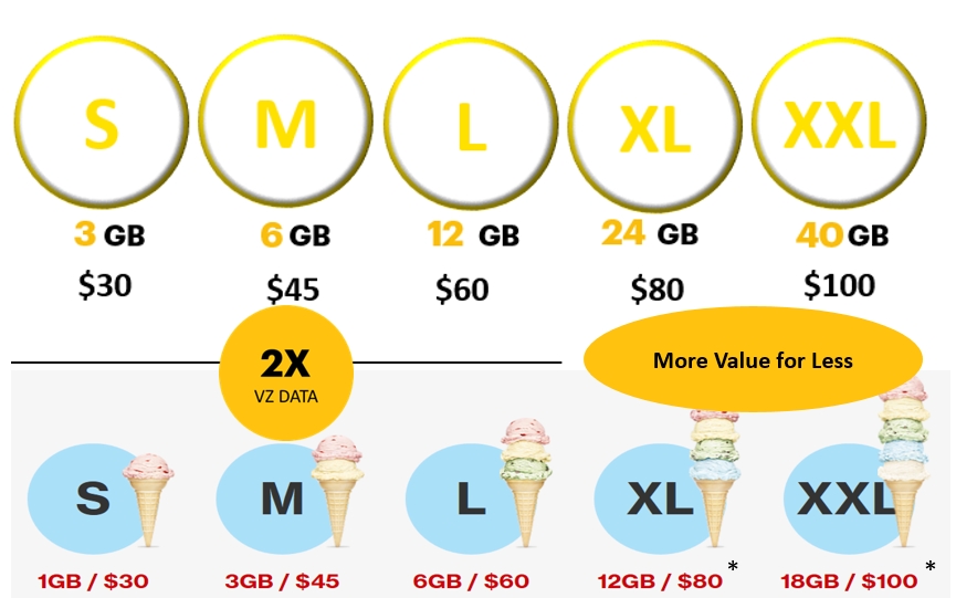 Ice cream cones aside, the chart above shows just how sweet of a deal Sprint's plans can be for Verizon customers. Sprint's top tier plan allows a family to share 40 GB of data for just $100. Under Verizon's plan, customers would pay the same price but get just 18 GB to share.