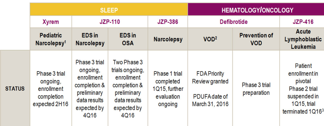 Looking beyond Xyrem, the company has built out a nice pipeline of products in late stage trials that will help to expand its position in both the sleep and hematology/oncology markets.