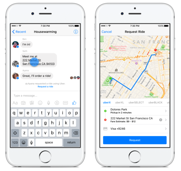 Facebook Transportation within Messenger enables users to request an Uber ride. Image source: Facebook.
