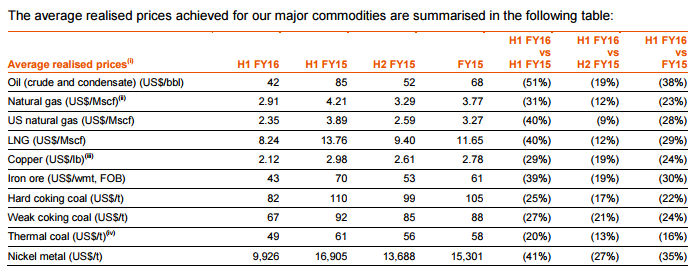 As expected, BHP Billiton's top and bottom lines continue to feel the heat of the weak commodity market. In fact, prices were lower year over year for every single commodity the company produces. The biggest hit, not surprisingly, was on the oil side, where realized selling prices fell a massive 50% year over year. Iron ore and nickel prices both fell around 40% percent. The best performing commodity for BHP was thermal coal which "only" fell 20%.