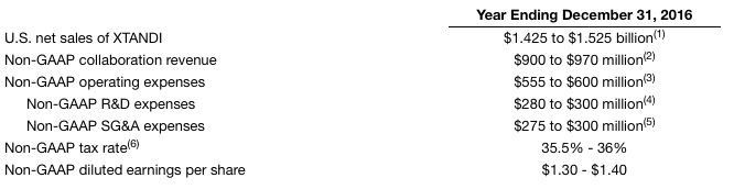 For reference, the company reported non-GAAP collaboration revenue of $695 million in 2015 and non-GAAP earnings per share of $1.01, so the midpoint of its ranges represents growth of roughly 35%. That's roughly in line with what the market was expecting, as analysts were projecting revenue of $910 million and $1.35 in earnings.