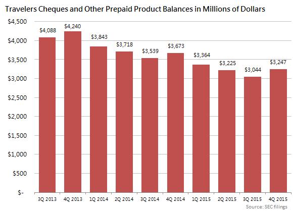 That the prepaid unit will live on may stand as some indication that Amex isn't cutting too deep just yet. American Express combines the balance sheet liabilities created by its prepaid cards with its Travelers Cheques. Although this line item grew quarter over quarter in its most recent report, year-over-year growth hasn't occurred. Growth, it appears, is only seasonal.