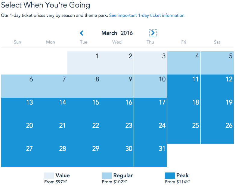 However, this is shaping up to be Disney's most aggressive annual price hike because it's shifting to a tiered pricing model based on season demand. If you want a one-day ticket to Disney World for a visit between now and Thursday it will cost you the same price -- $105 for the Magic Kingdom and $97 for either EPCOT, Animal Kingdom, or Disney's Hollywood Studios. However, come Friday the ticket prices will go to $110 for the iconic Magic Kingdom park and $102 for Disney's three other gated attractions. A week after that, spring break pricing goes into effect with folks paying $124 for a day at the Magic Kingdom and $114 for the other three destinations.