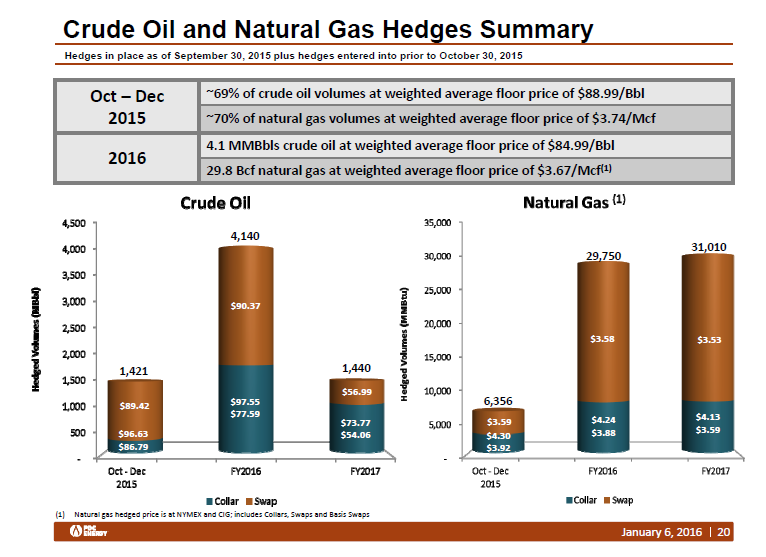 However, the most important aspect that should drive this year's performance, and that probably isn't given due importance, is the company's extremely well-hedged production portfolio. Around 4.1 million barrels of crude oil and 29.8 Bcf of natural gas sales are hedged at a weighted average price of $84.99 per barrel and $3.67 per Mcf, respectively. That means a total of 9.1 MMBoe -- or a solid 41% of total expected production for 2016 -- is hedged at prices that are more than double that of existing spot rates for these commodities.