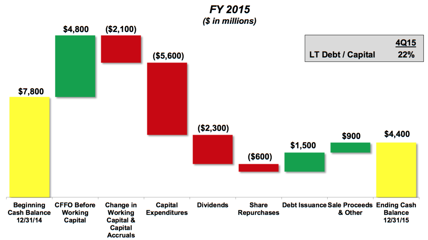For example, the company frequently points to its $4.4 billion cash hoard, as well as an industry leading long-term debt-to-capital ratio of just 22%. There's no doubt that the company is better positioned than its peers (hence the affirmation of its S&P rating at single-A with a stable outlook), but if you break down 2015's cash burn, things may not stay rosy for long. Cash flow from operations was only $4.8 billion last year, despite average realized prices of greater than $40 a barrel. Capital expenditures alone wiped out any possibility of generating positive free cash flow.