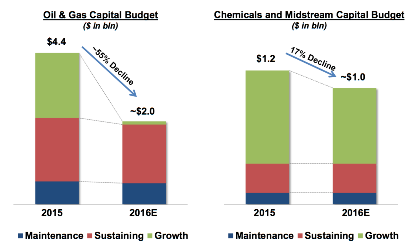 To preserve cash, most oil and gas companies have turned to gutting its capital expenditure budget. Occidental's plans for 2016 call for reducing its oil and gas capital budget by roughly $2.2 billion. This plan provides some breathing room, but two major concerns remain.