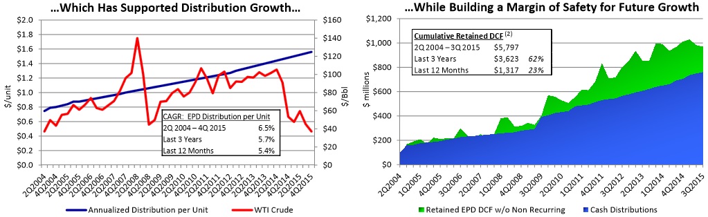 This provides both Enterprise Products Partners' and Kinder with distributable cash flow (DCF) -- which is what's needed for the sustainable and steady distribution increases -- with incredible stability despite oil prices collapsing 70% since their mid-2014 highs. For instance, in 2015 Enterprise's cash flow (excluding asset sales) increased 2.5%, quite impressive given the carnage of the current energy markets.