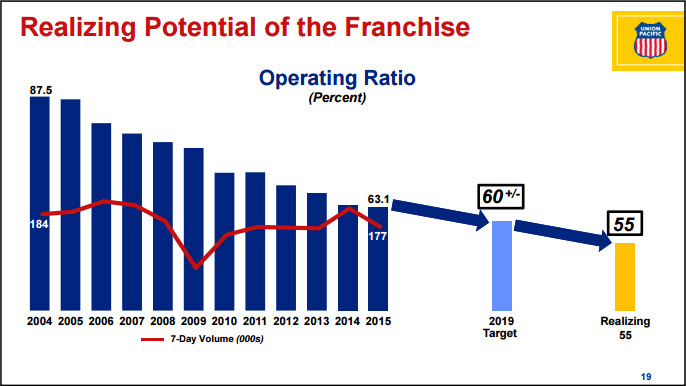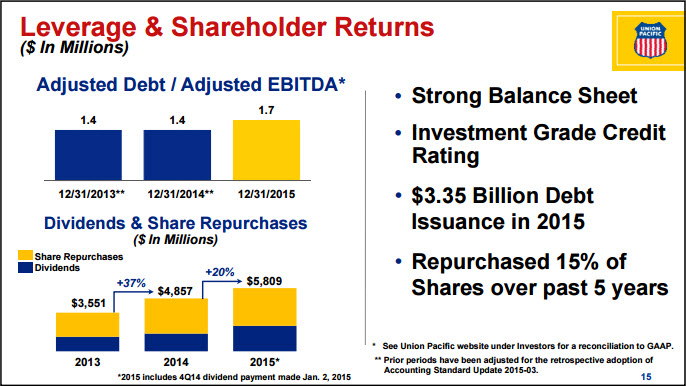 A key metric for railroads is the operating ratio, which is a primary measure of profitability, expressing a company's operating expenses as a percentage of revenue -- the inverse of operating margins. Union Pacific was able to drop its operating ratio to 63.1% in 2015, its best year ever. Management continues to focus on this number, with a goal of hitting 60% by 2019. The lower the operating ratio, the more efficient the company. Union Pacific consistently has one of the best operating ratios in the industry.
