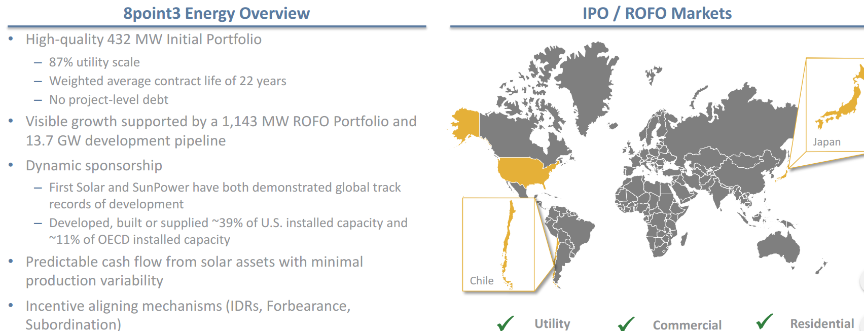 If you like First Solar, and SunPower, you're going to love 8point3 Energy Partners (NASDAQ: CAFD). As a joint yieldco of First Solar and SunPower, the two companies pass down steady solar projects to enjoy both leaner financials for themselves, as well as tax breaks for 8point3 Energy Partners and its investors. Named for the time it takes light to travel from the sun to Earth -- 8.3 minutes -- this growth-oriented limited partnership currently holds around 430 MW of projects with an average 22-year contract life, 87% of which are utility-scale. With First Solar and SunPower continuing to push projects along, 8point3 also enjoys a 13,700 MW development pipeline that it can dip into in the future.