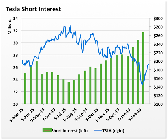 The past couple of months have been a good time to be short shares of Tesla Motors (TSLA +1.70%). True, the entire month of January was a good time to be short just about anything -- after all, 2016 got off to a worse start than any other calendar year in the market's history -- but Tesla was hit especially hard. For the first five weeks of 2016, the electric-car maker's shares shed almost exactly $100, or over 40% of their value.