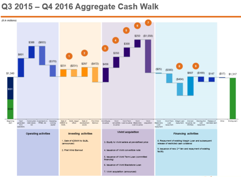 SunEdison has seen the light and is working to make its cash flow positive and steady. The chart below shows how the company will move cash over the next year (click here and advance to slide 14 for a full-resolution version).