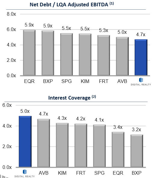 This business model seems to be working. Digital Realty's properties generate higher rates of return than those of its REIT peers, and the stock pays an above-average dividend. The company has grown its FFO per share by an average rate of 14.2% per year -- well above other leading REITs. In fact, Digital Realty just announced its 11th consecutive dividend increase, which has grown at a 14% average rate since the IPO. Impressively, Digital Realty has done this with a relatively conservative balance sheet. The company has less debt relative to its EBITDA than its peers, and its interest coverage is higher as well.