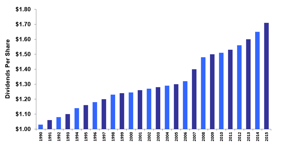This business strategy results in consistent market-beating performance. National Retail Properties has averaged a 14.8% total return over the past 25 years and has increased its dividend every year during that time.