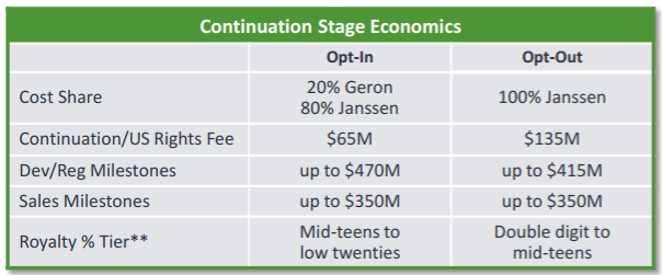 Johnson & Johnson's deal was heavily back-loaded, paying just $35 million upfront. If data from the IMbark or IMerge trials inspire J&J to continue the collaboration, the lion's share of the deal's potential value comes into play. Geron even has the option to pick up 20% of development and commercialization costs for a larger cut of potential sales.