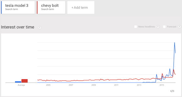 There's this temptation to compare General Motors' (GM +1.70%) upcoming Chevy Bolt to the Model 3, and while the two EVs will compete on paper, I see little overlap. By some measures, Model 3 already has more interest than the Bolt, which will hit the market first. Consider current search trends as a rough proxy for consumer interest: