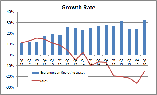 As equipment sales have declined, Deere has dramatically increased the amount of equipment it leases: