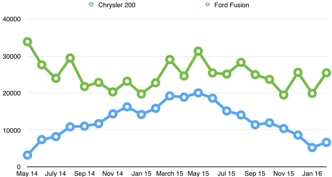The 200 was well-received initially, but steady demand never really arrived. The chart below shows monthly U.S. sales of the current-generation 200 since its launch in the spring of 2014, alongside sales of the rival Ford Fusion. While the Fusion's sales have bounced up and down within a steady range, the 200's rose to a peak early last year that proved to be unsustainable.