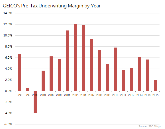 GEICO recorded a pre-tax operating margin of just 2%, well below its 18-year average underwriting margin of 5.8%.